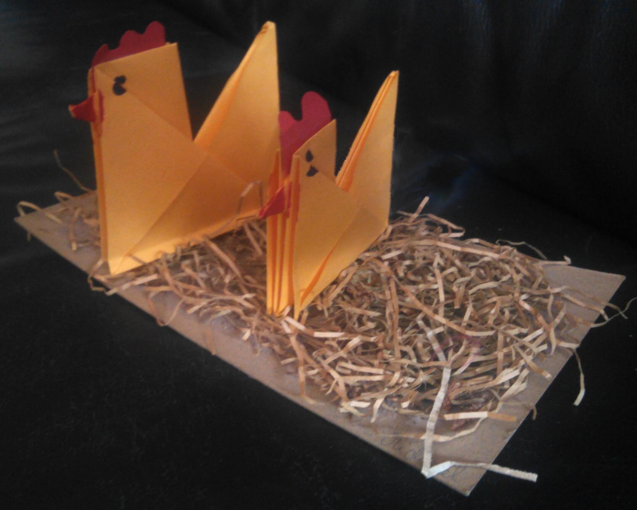 Die Anleitung zum Falten der Hühner ist etwas länger, aber man findet sie, wenn man nach Origami-Hühnern sucht, sodass ich sie hier nicht wiederholen will. Anschließend kann man sie auf ein Stück Pappe mit Ostergras kleben.